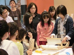 次に、講師から手織り機の使い方を教わります。講師の手元をよく観察して、手順をしっかりと学んだら、いよいよ製作開始です!