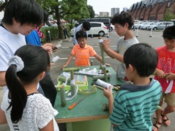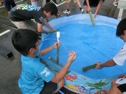 何度も発射させているとだんだんコツがつかめてきました。的当て競争の後は一斉発射!すっかりびしょ濡れになりましたが、みんな笑顔です♪自然素材は一つとして同じ物はありません。自分なりに工夫し、実際使うという貴重な体験を生かして、これからも色々なモノづくりにチャレンジしてみて下さいね。