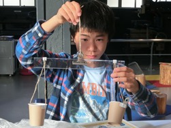 まずは金属の比重について学ぶ実験をします。紙コップ、麻ひも、クリップ、定規で即席の天秤ばかりを作って、3種類のスプーンの重さを1円玉で計量します。それぞれの金属の名称と、何枚の1円玉と同じ重さかという予想をみんなが答えていきます。正解枚数は、銅27枚、ステンレス25枚、アルミ8枚。