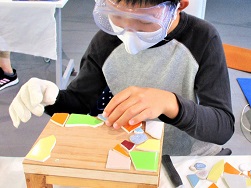 タイルの角をヤスリで磨いたらデザイン決め!大きさや色を見ながら、パズルのように並べていきます。