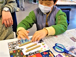 「ずれないように貼り重ねるのは緊張する・・・」「上から見て調整してみよう」「影ができて立体的に見える!横から見るとよくわかるね♪」
