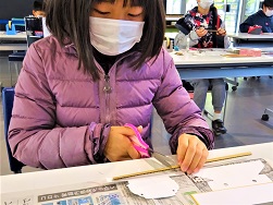 次に、材料を確認します。ヘッドランプのLEDがしっかりと点灯するかチェックして作業開始!写真を線に沿って切り抜きます。一番下の写真はあらかじめ立体フレームに貼ってあるため、切り抜くのは中間と一番上の2枚!キレイに切ると、より立体な作品に仕上がると吉田さんにアドバイスを受けました。