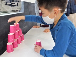 残りの5発は机に押しつけて撃ちます。動作に問題無ければ、いよいよ的当て競技!10個積んだ紙コップを的にして、いくつ撃ち落とせるかを競います。