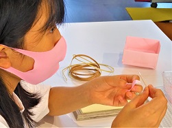 型紙を貼り合わせてお花作り!紙の特徴などの説明も聞きながら、丁寧に作業を進めます。