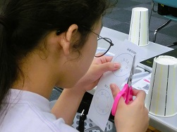 子どもたちはモニターに映した先生の手元と手順書をしっかり確認して、紙コップの底に穴を開けたり丁寧に取り組んでいました。