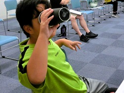 なぜ逆さまに映るのか?ピントの合わせ方を教わり、子どもたちはいろいろと試しながら、映る景色を興味津々で観察していました。
