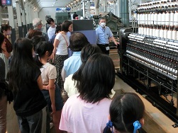 まずは羊毛の特徴などの説明を聞いたところで、繊維機械館に移動して江戸時代の糸紡ぎや、昭和初期の機械で糸を紡ぐ実演を見学。