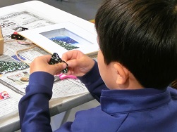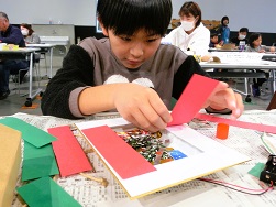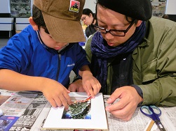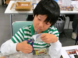 子どもたちは、写真の切り残しや段ボールのはみ出しが無いかなど、細かな部分まで丁寧に取り組んでいました。