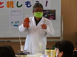 はじめに、物質が水に溶けるとは?溶解度や再結晶について、実験ショーやクイズを交えながら楽しく学びました。