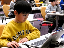 子どもたちは、工作キット、コンピューター、キーボードなど使って、真剣な表情で取り組んでいました。