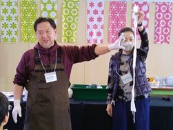 はじめに、絞り染めとはどのようなものか、技法、歴史など実演を交えて楽しく学びました。