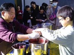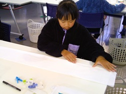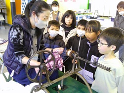 子どもたちは作品を干している間に、先生からほかの技法の実演と体験もさせていただきました。