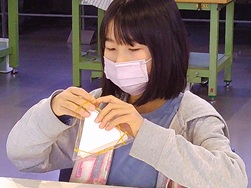 子どもたちは、くっきりと模様が出るよう手でしっかりと布を押さえつけながら、丁寧に折っていました。