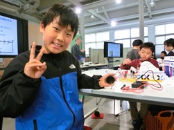 子どもたちは、さらに大きな電気を流すために、並び順を変えてみたり、しゃがんでみたり、